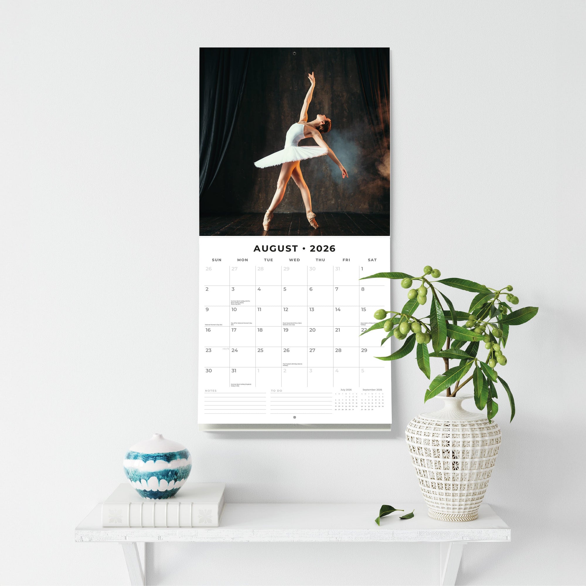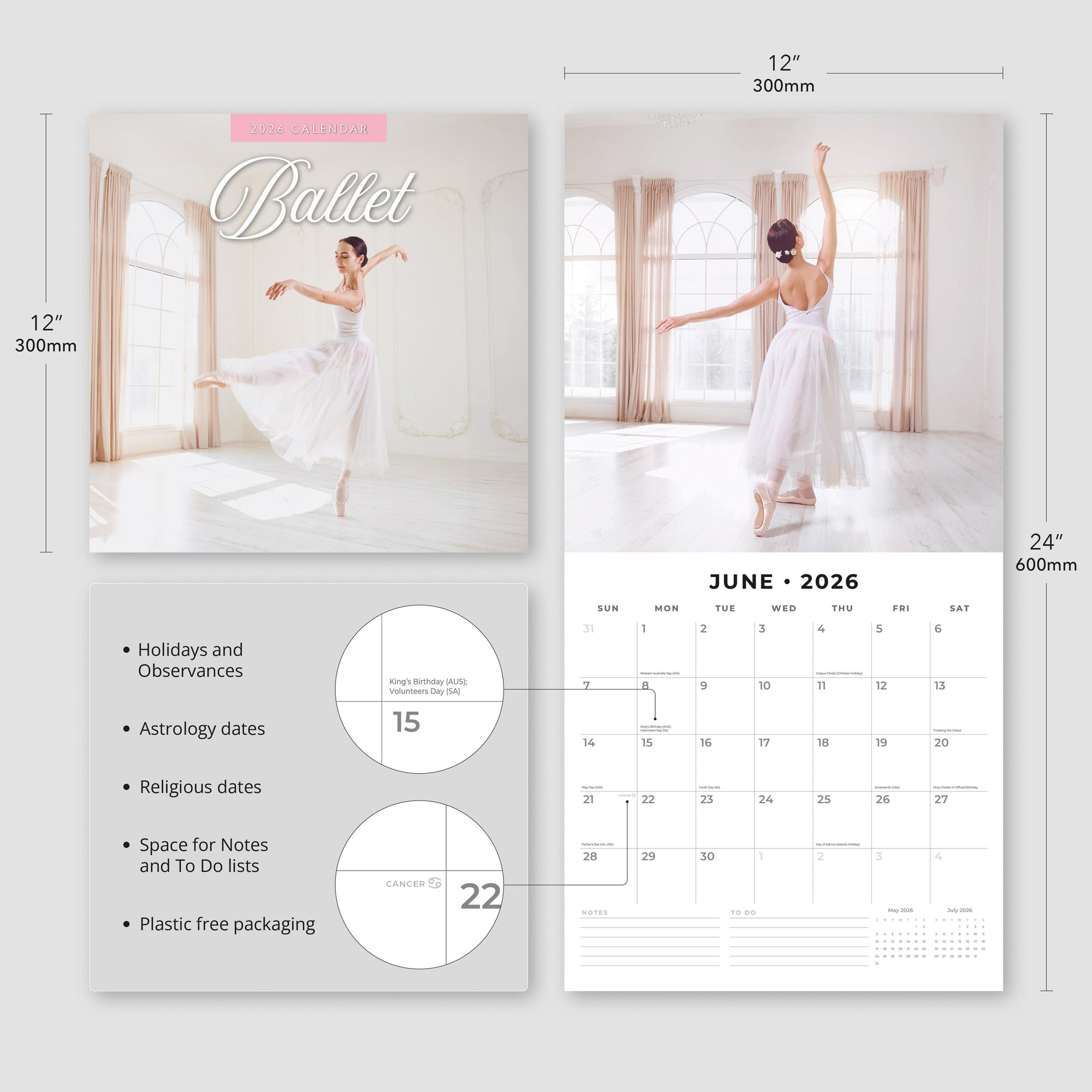 • Premium 12" x 24" open wall calendar featuring vivid images of Ballet, printed on thick & sturdy paper.