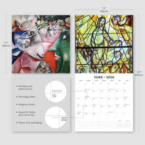 - Premium 12" x 24" open wall calendar featuring vivid images of Chagall, printed on thick & sturdy paper.