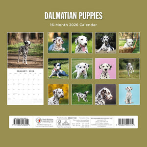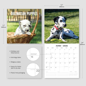• Premium 12" x 24" open wall calendar featuring vivid images of Dalmatian Puppies, printed on thick & sturdy paper.