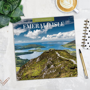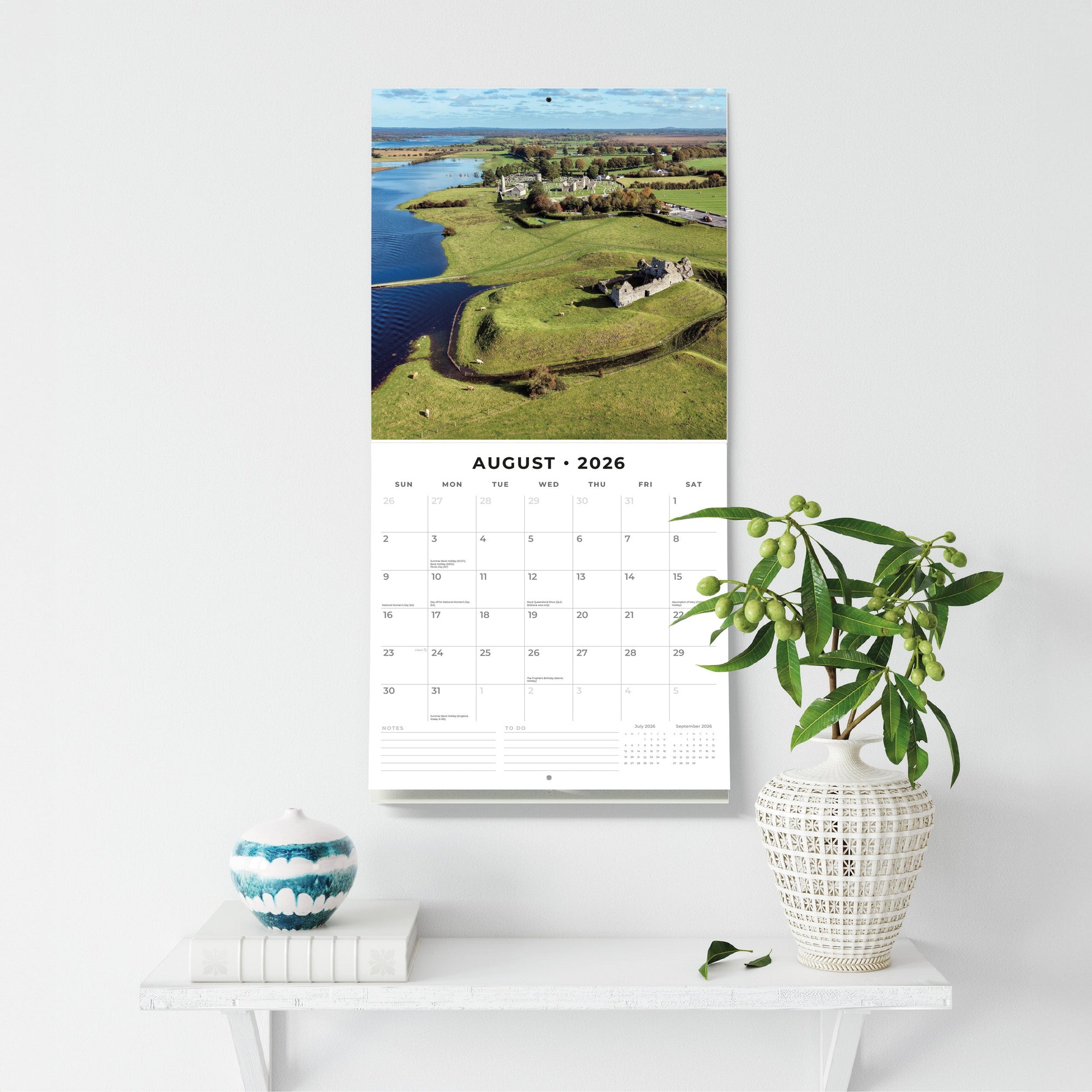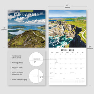 Transport yourself to misty coastlines and verdant hills with this Emerald Isle 2026 Wall Calendar. Opening to 12" × 24" on premium thick & sturdy paper, it’s designed for daily viewing and resists wear. The hangable 12-month format is plastic free and features a lined notes & to-do area—perfect for travel itineraries, Gaelic phrases, or poetry lines—while vivid spreads celebrate Ireland’s lush landscapes and historic ruins.
