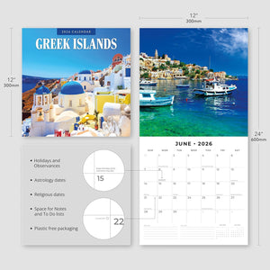 - Premium 12" x 24" open wall calendar featuring vivid images of Greek Islands, printed on thick & sturdy paper.