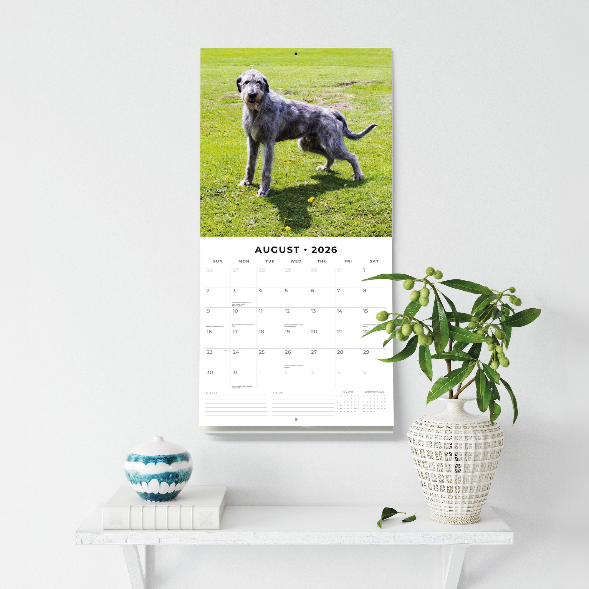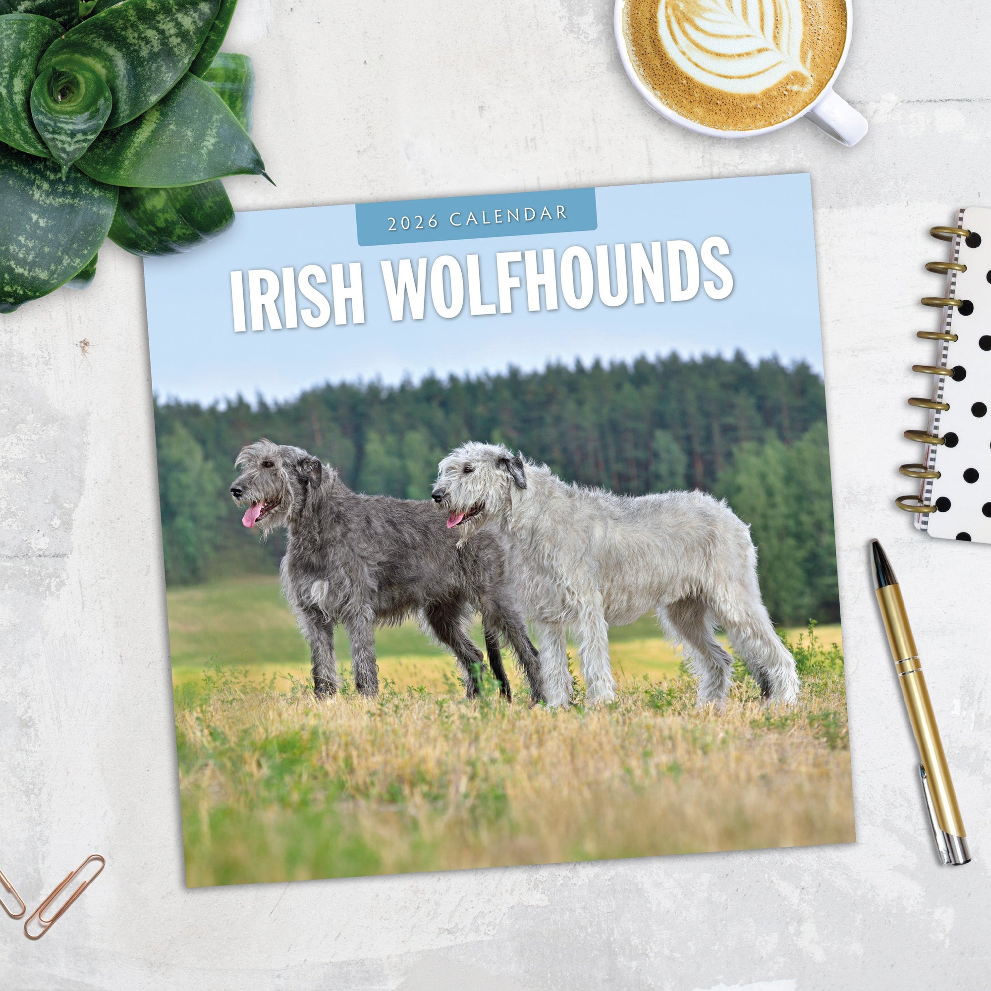 - Premium 12" x 24" open wall calendar featuring vivid images of Irish Wolf Hounds, printed on thick & sturdy paper.