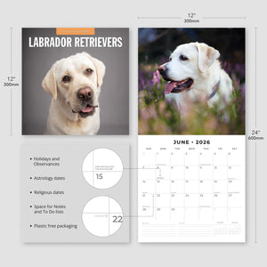 Enjoy twelve months of unwavering affection with this Labrador Retrievers calendar, opening to 12" × 24" on premium thick & sturdy paper. The hangable 12-month format is 100% plastic free and features a lined notes & to-do area on each page—ideal for logging fetch routines, swim sessions, or family fun—while vivid imagery highlights their playful spirit and glossy coats.