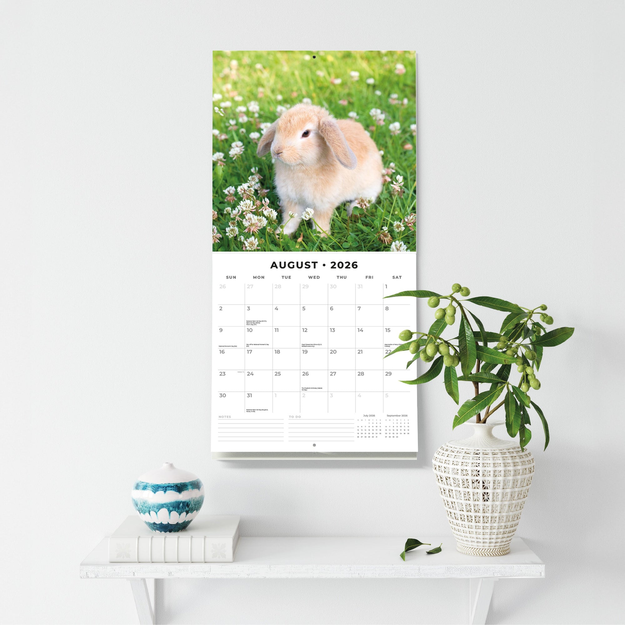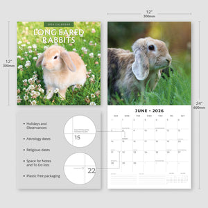 - Premium 12" x 24" open wall calendar featuring vivid images of Long Eared Rabbits, printed on thick & sturdy paper.