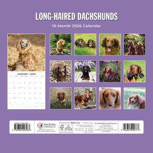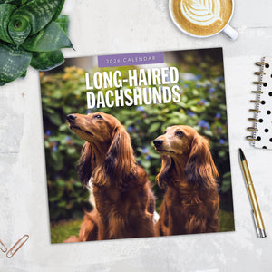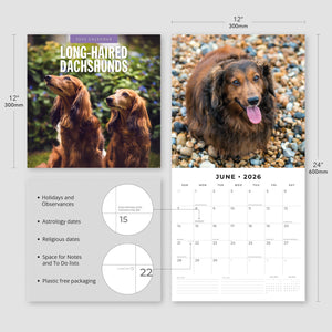 • Premium 12" x 24" open wall calendar featuring vivid images of Long-haired Dachshunds, printed on thick & sturdy paper.