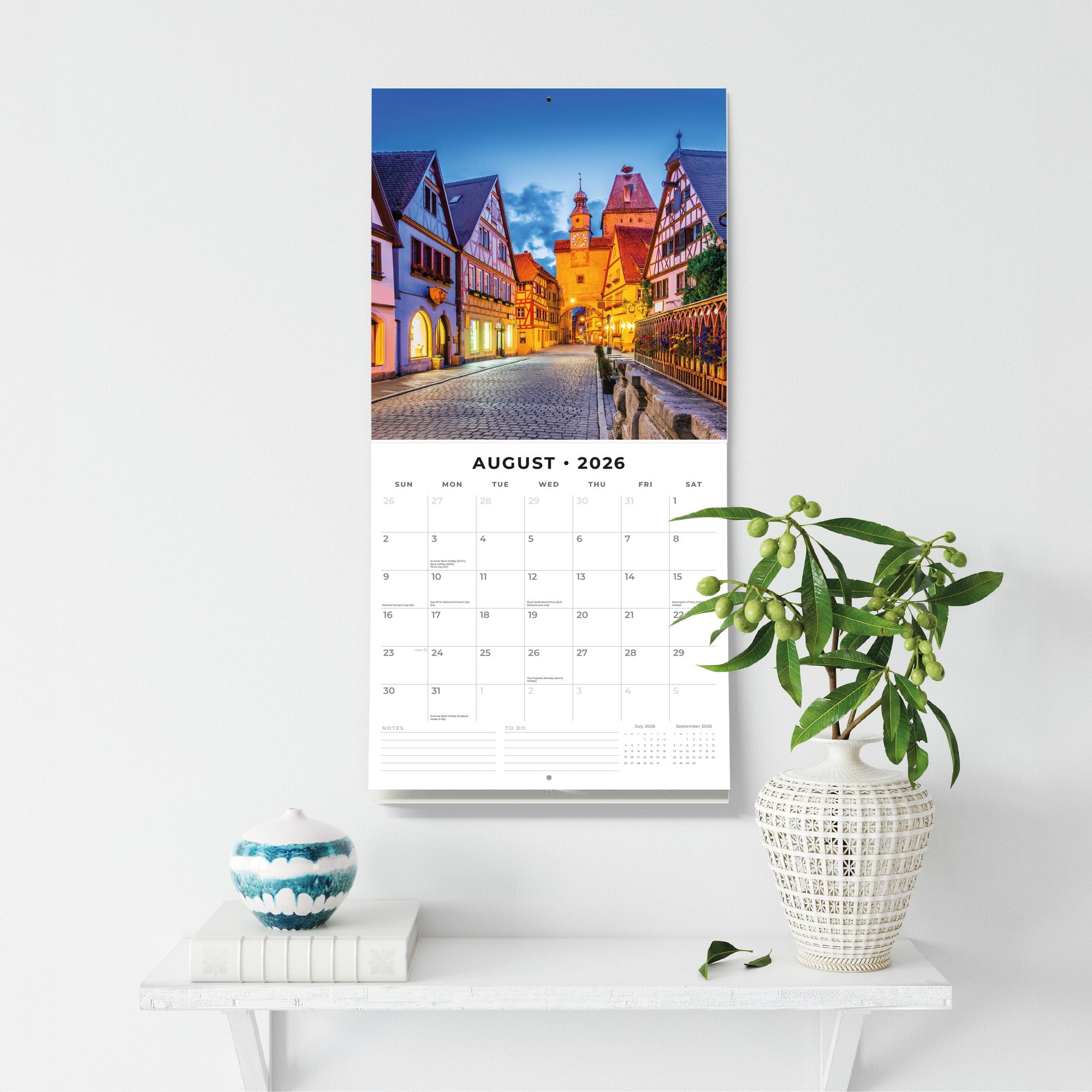 • Premium 12" x 24" open wall calendar featuring vivid images of Medieval Towns, printed on thick & sturdy paper.