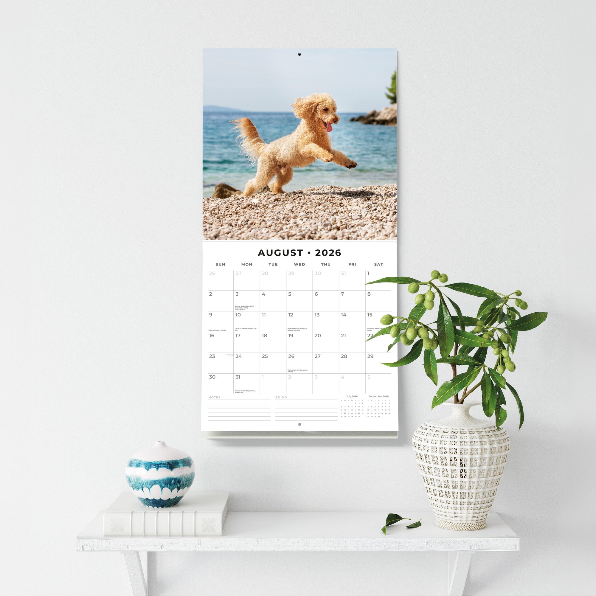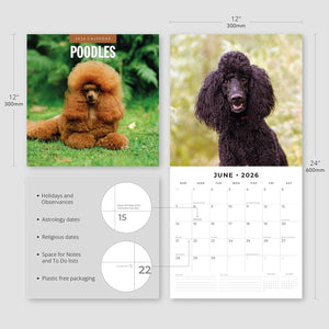 - Premium 12" x 24" open wall calendar featuring vivid images of Poodles, printed on thick & sturdy paper.