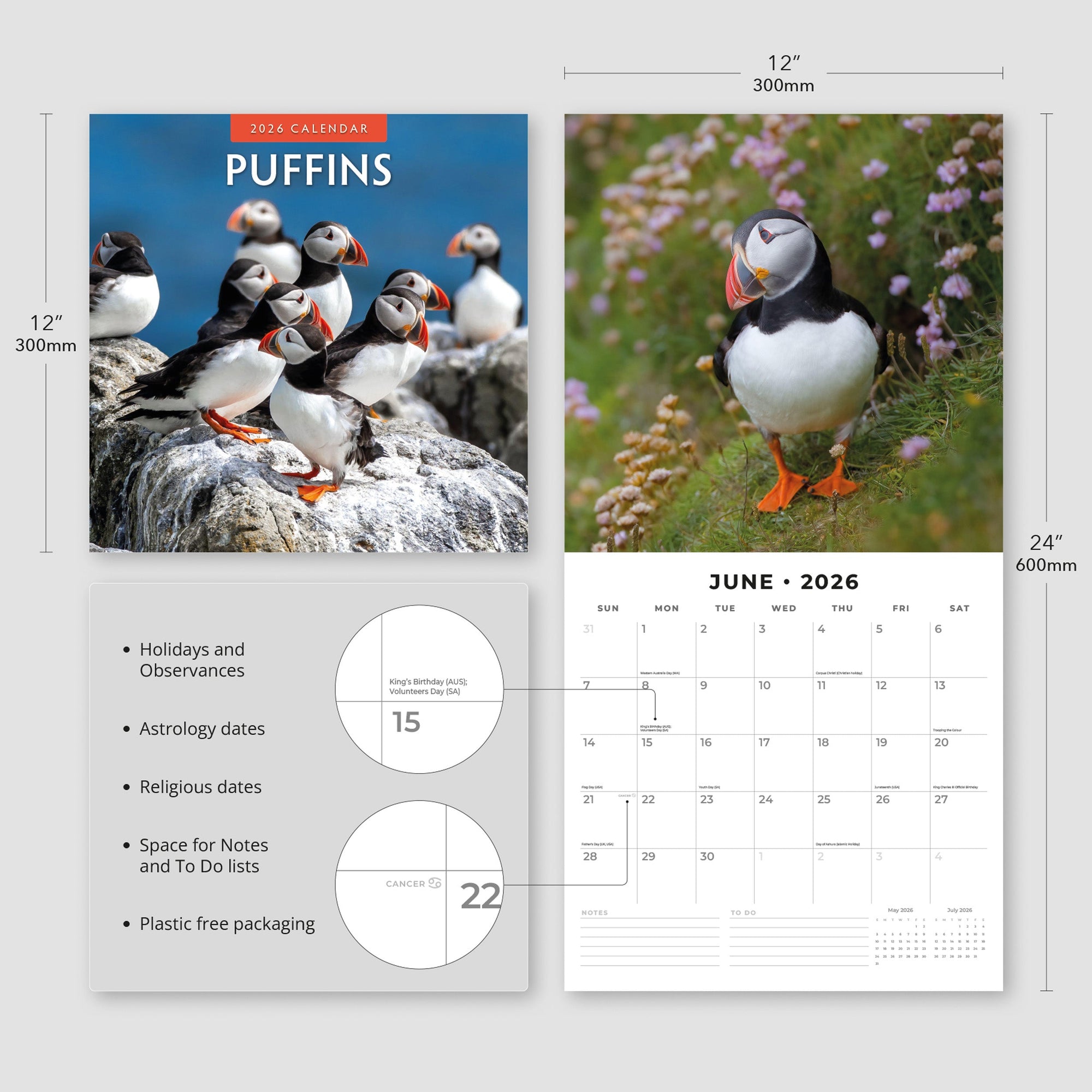 - Premium 12" x 24" open wall calendar featuring vivid images of Puffins, printed on thick & sturdy paper.
