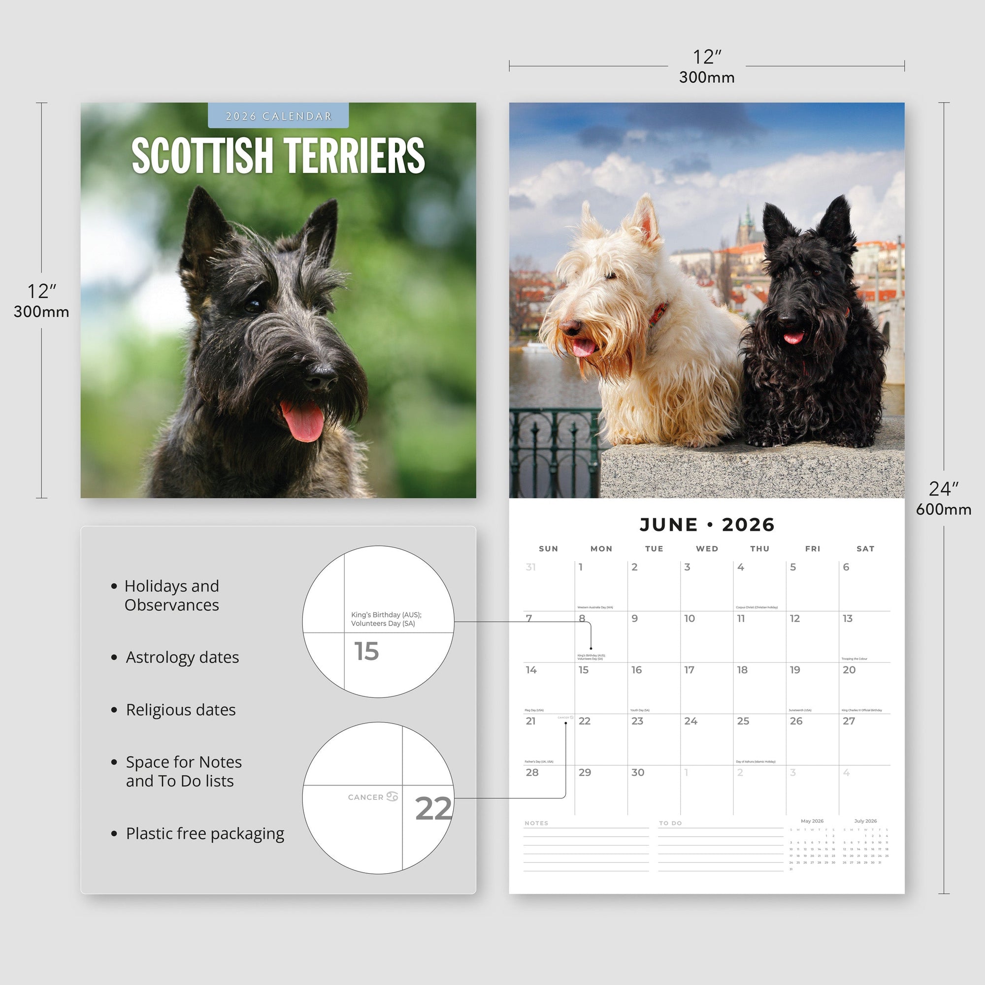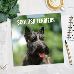- Premium 12" x 24" open wall calendar featuring vivid images of Scottish Terriers, printed on thick & sturdy paper.