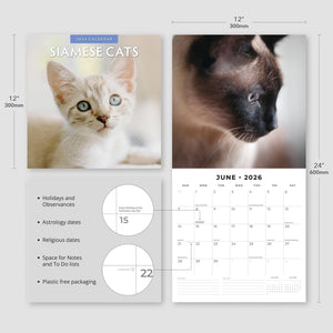- Premium 12" x 24" open wall calendar featuring vivid images of Siamese Cats, printed on thick & sturdy paper.