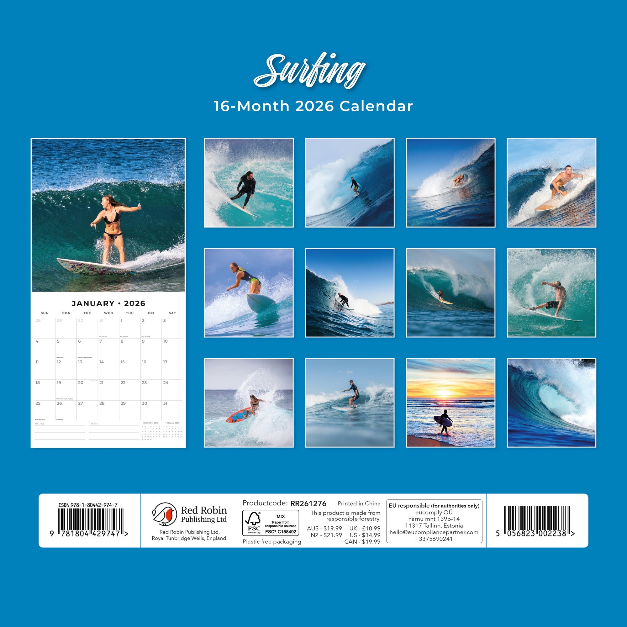 - Premium 12" x 24" open wall calendar featuring vivid images of Surfing, printed on thick & sturdy paper.