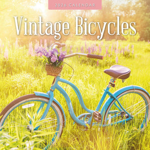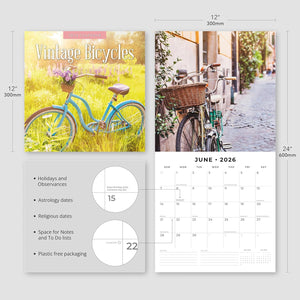 - Premium 12" x 24" open wall calendar featuring vivid images of Vintage Bicycles, printed on thick & sturdy paper.