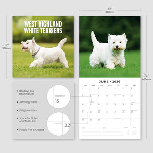 - Premium 12" x 24" open wall calendar featuring vivid images of West Highland White Terriers, printed on thick & sturdy paper.