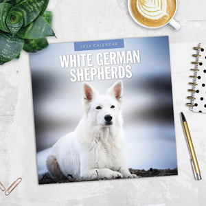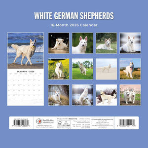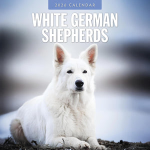 - Premium 12" x 24" open wall calendar featuring vivid images of White German Shepherds, printed on thick & sturdy paper.