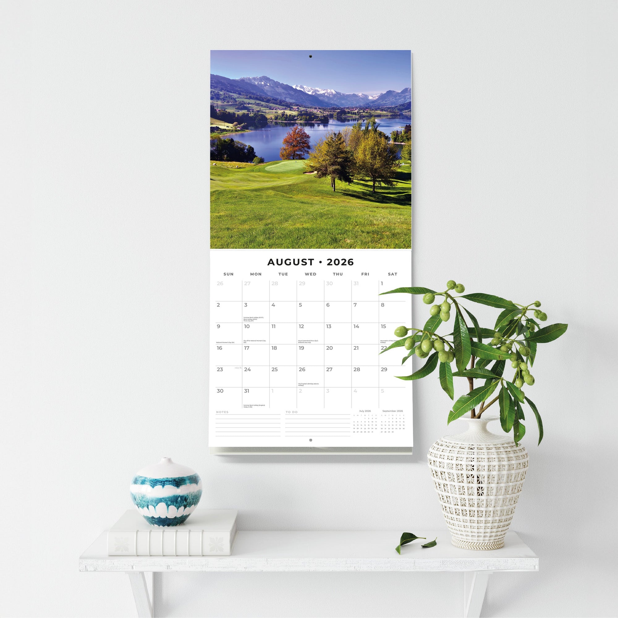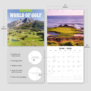 Master your swing with this World of Golf 2026 Wall Calendar, opening to 12" × 24" printed on premium thick & sturdy paper. The hangable 12-month format is 100% plastic free and offers a lined notes & to-do area—ideal for tee time tracking, tournament schedules, or club maintenance logs—while vivid spreads showcase legendary courses from St. Andrews to Augusta.