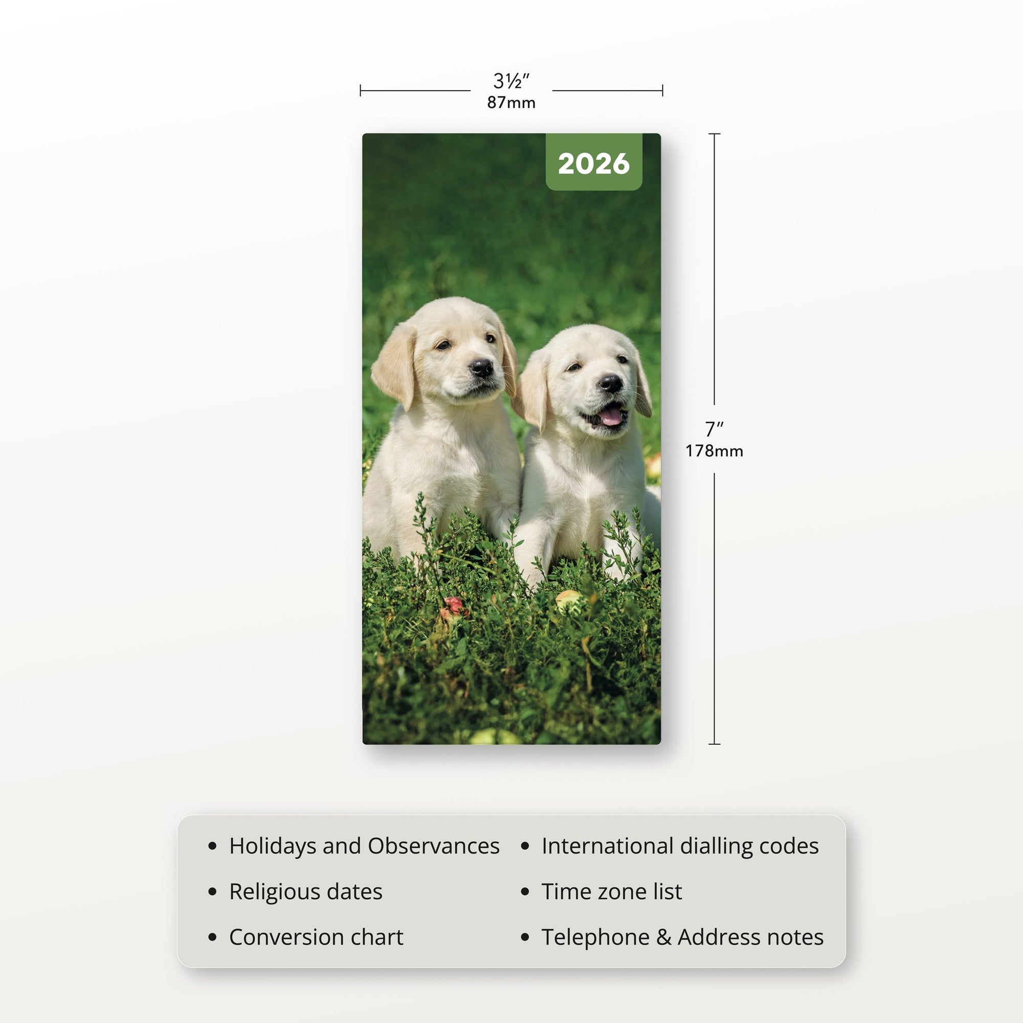• Premium 7" x 3.5" slim pocket weekly planner with a hardcover image of Dogs & Puppies, printed on thick & sturdy paper.