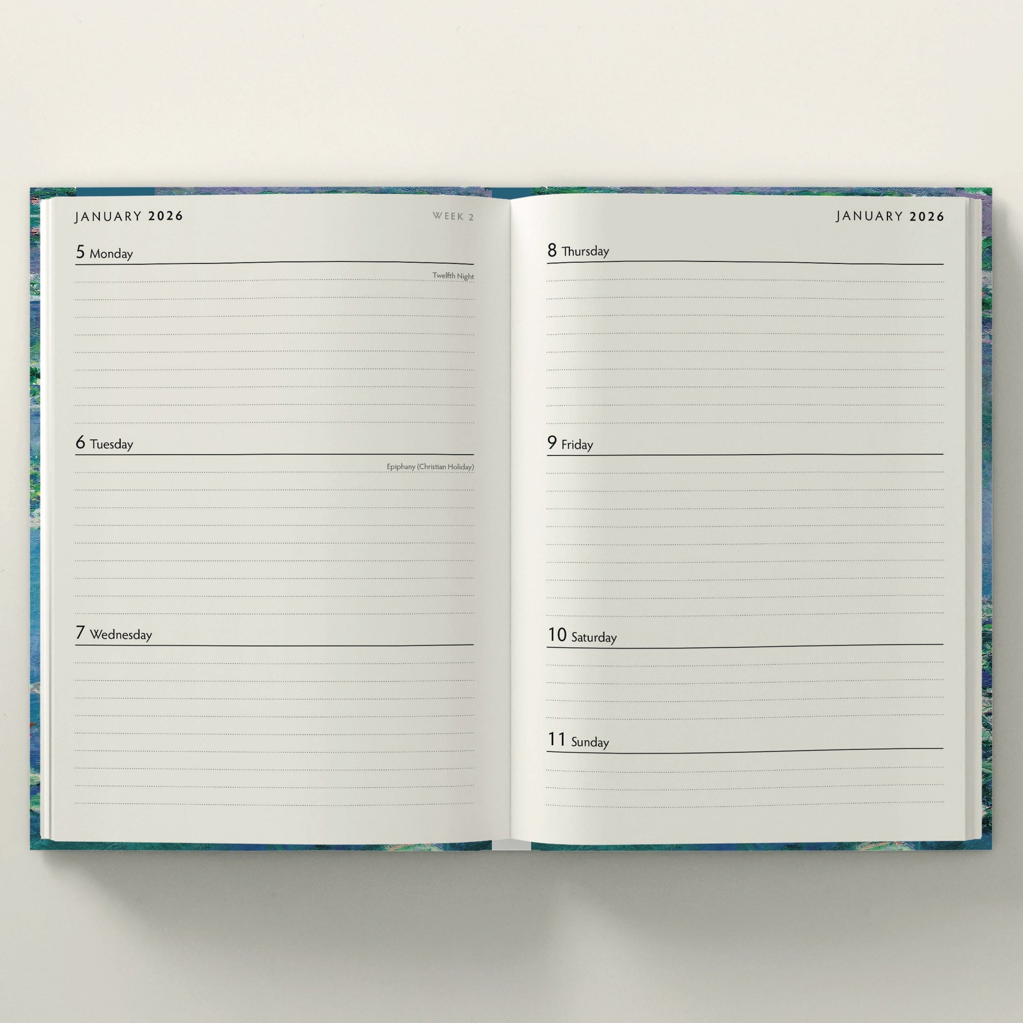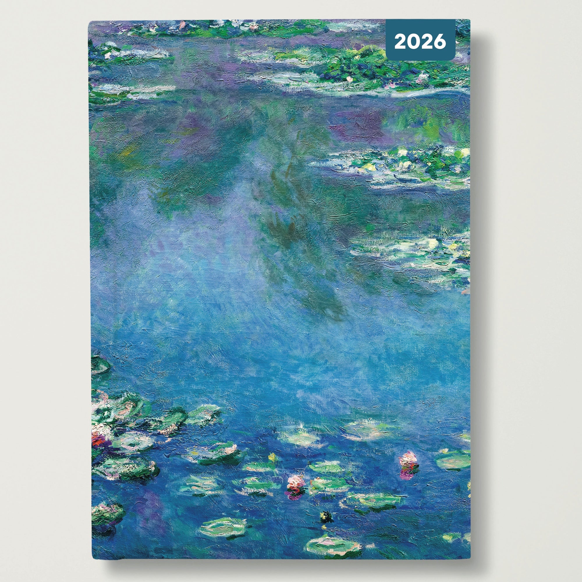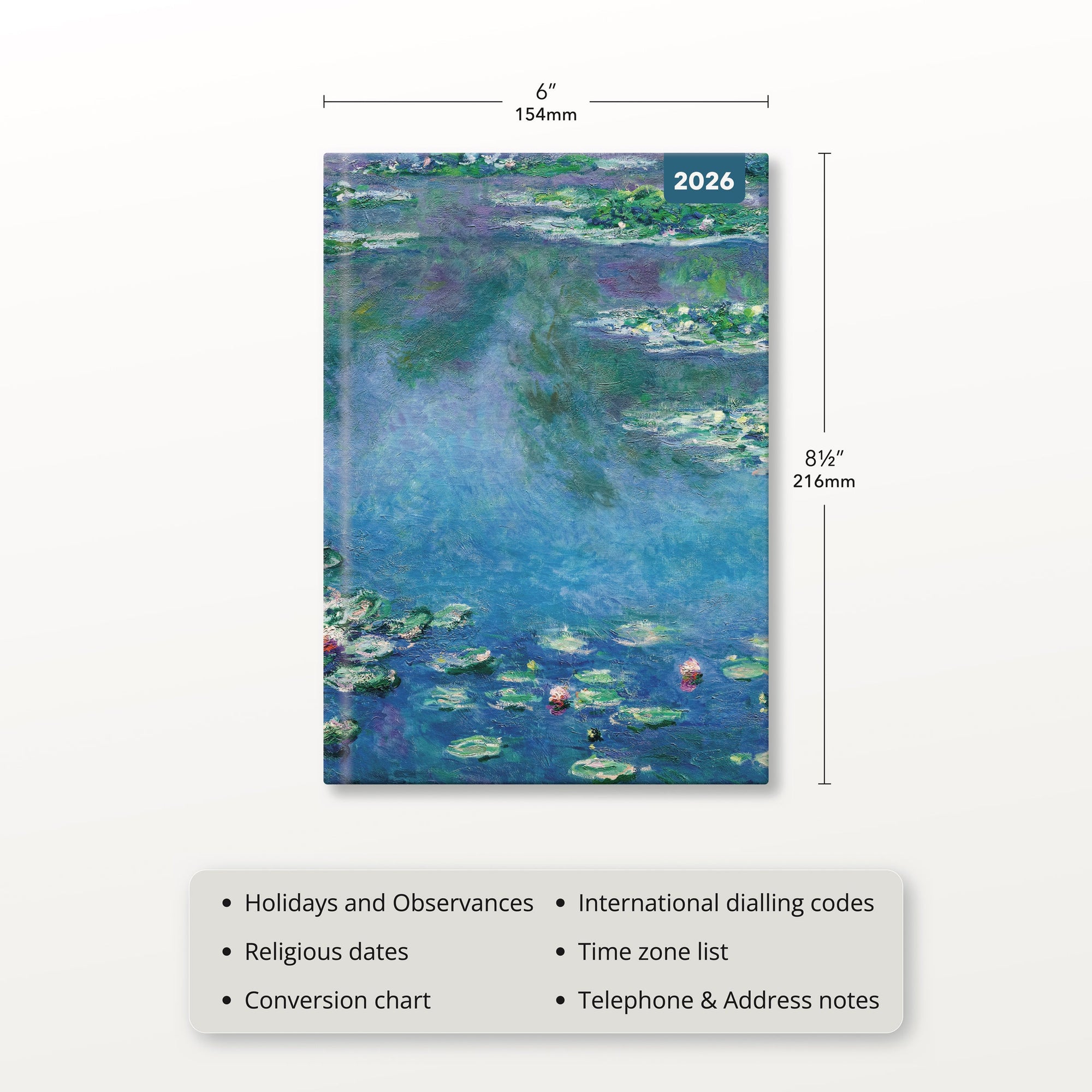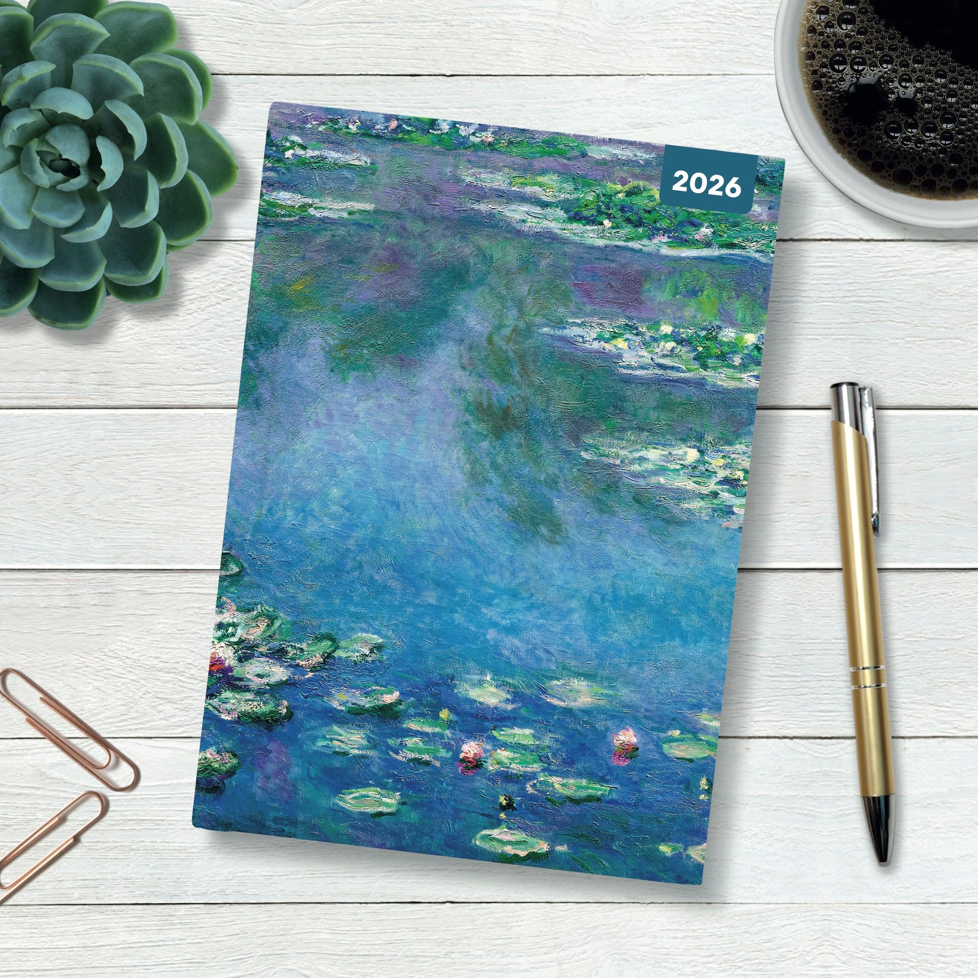 • Premium 8 1/2" x 6" A5 padded weekly planner with a hardcover image of Monet, printed on thick & sturdy paper.