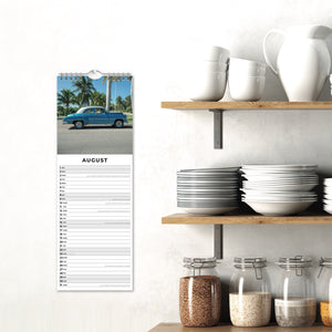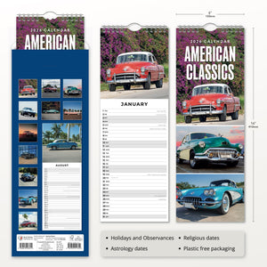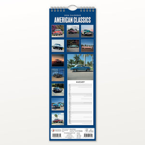 • Premium 6" x 16" open slim wall calendar featuring vivid images of American Classics, printed on thick & sturdy paper.
