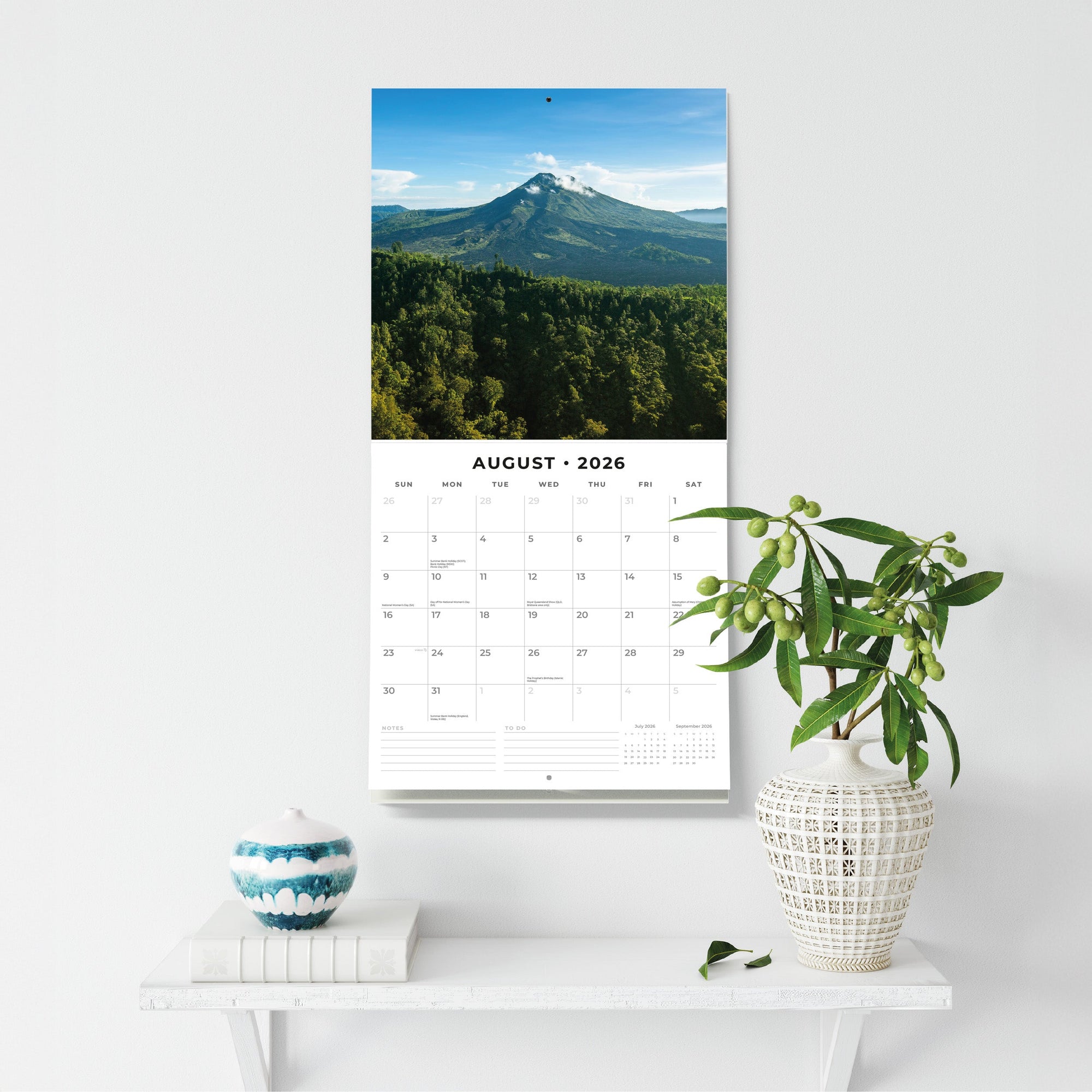 Escape to tropical paradise with this Bali 2026 Wall Calendar, printed on 12" × 24" premium thick & sturdy paper that endures daily use. The hangable 12-month design is plastic free and includes a lined notes & to-do area—ideal for surf schedules, temple tours, or yoga retreats—while vivid spreads capture emerald rice terraces, cliffside sunsets, and volcanic peaks.