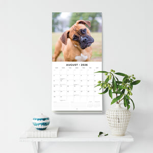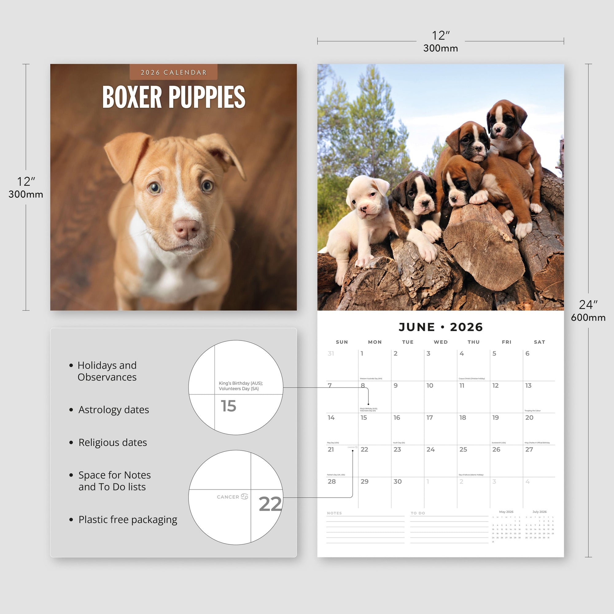 • Premium 12" x 24" open wall calendar featuring vivid images of Boxer Puppies, printed on thick & sturdy paper.