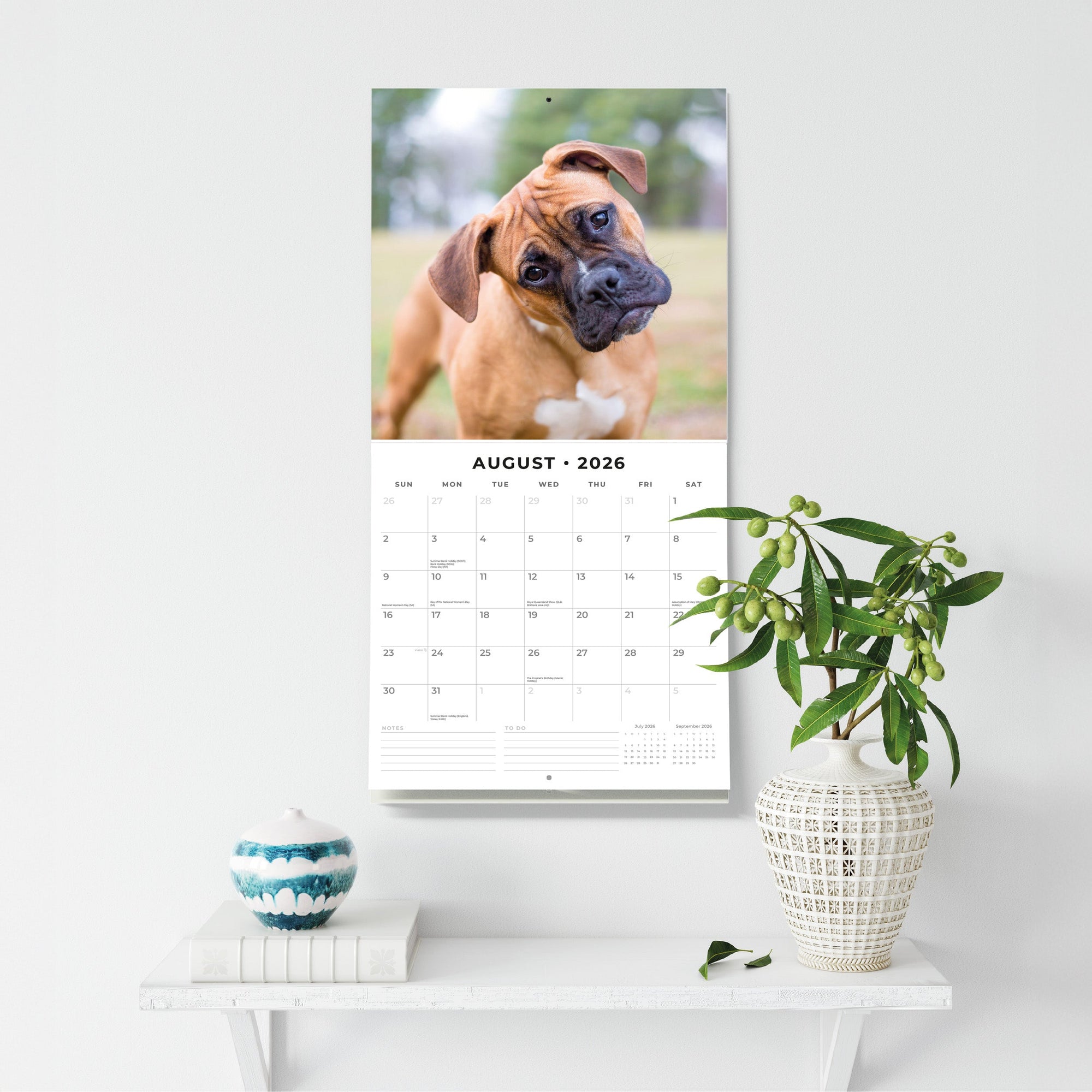 Capture puppy exuberance with this Boxer Puppies calendar, opening to 12" × 24" on premium thick & sturdy paper made for playful households. The hangable 12-month layout is plastic free and features a lined notes & to-do area on each page—perfect for tracking first steps, nap schedules, or toy wish lists—while vivid shots capture their boundless energy and adorable floppiness.