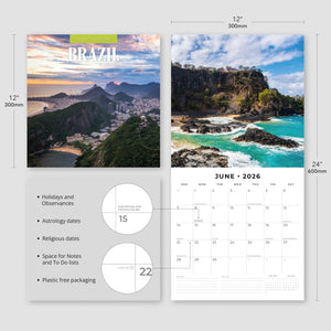 - Premium 12" x 24" open wall calendar featuring vivid images of Brazil , printed on thick & sturdy paper.