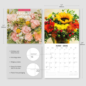 - Premium 12" x 24" open wall calendar featuring vivid images of Floral Bouquet, printed on thick & sturdy paper.