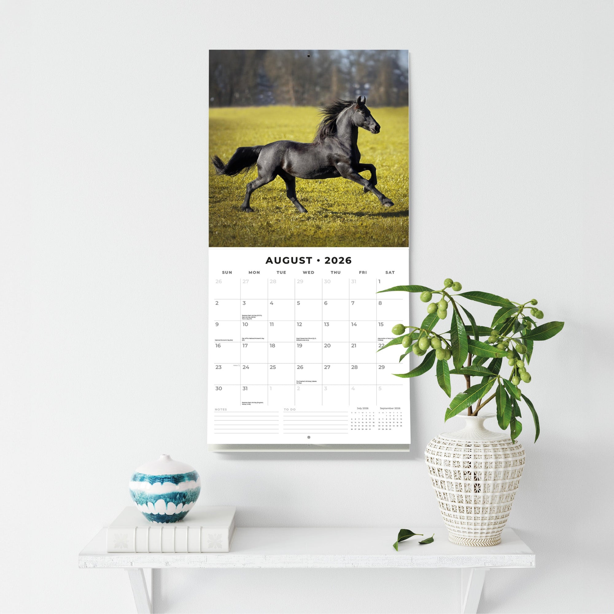 - Premium 12" x 24" open wall calendar featuring vivid images of Horses, printed on thick & sturdy paper.