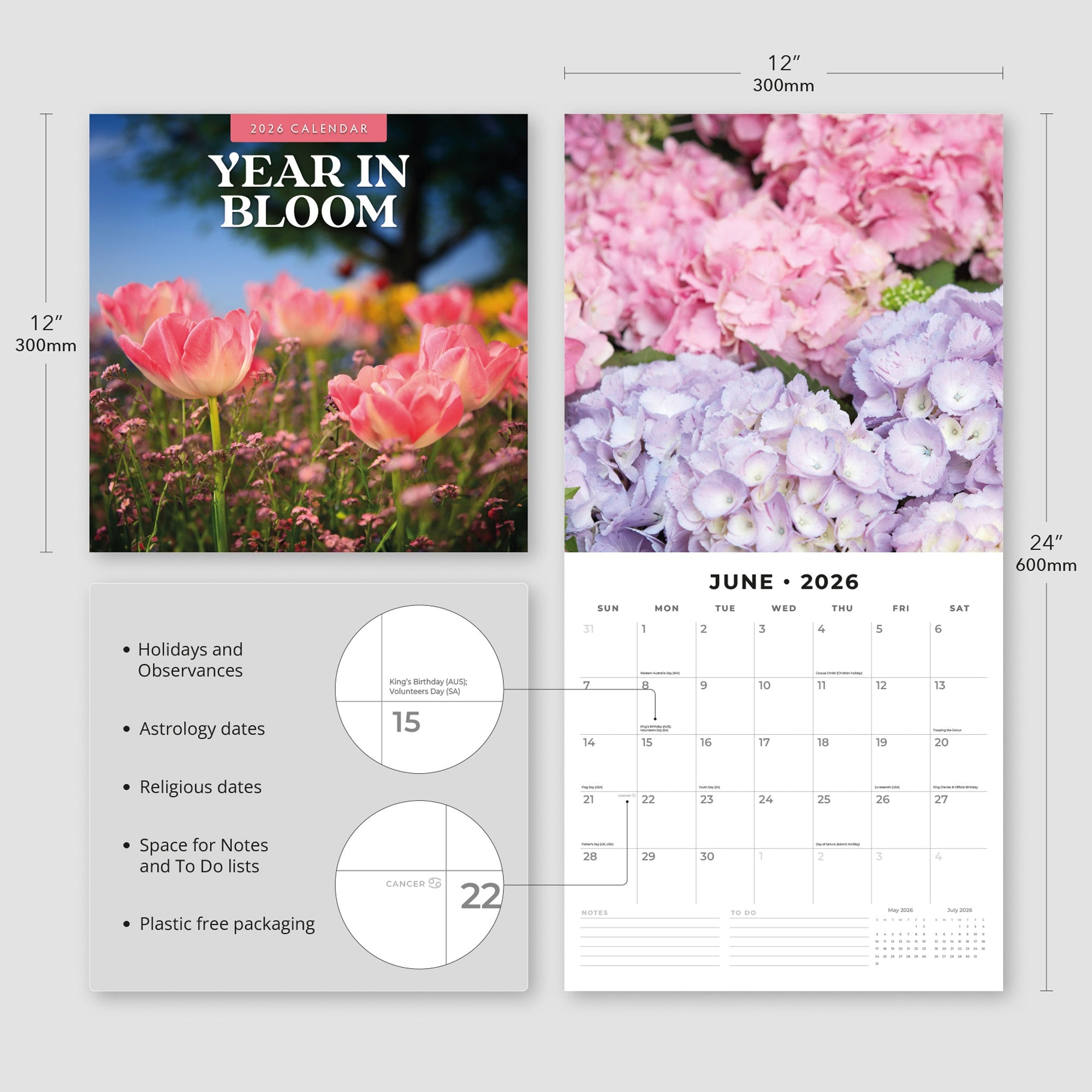 Experience petals in every season with this Year in Bloom 2026 Wall Calendar, opening to 12" × 24" of premium thick & sturdy paper. The hangable 12-month design is 100% plastic free and offers a lined notes & to-do area on each page—ideal for monthly goals, garden diaries, or floral arrangements—while vivid spreads highlight signature blooms from January’s snowdrops to December’s poinsettias.