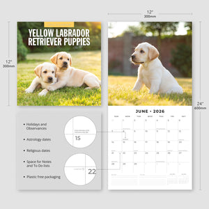 - Premium 12" x 24" open wall calendar featuring vivid images of Yellow Labradors, printed on thick & sturdy paper.