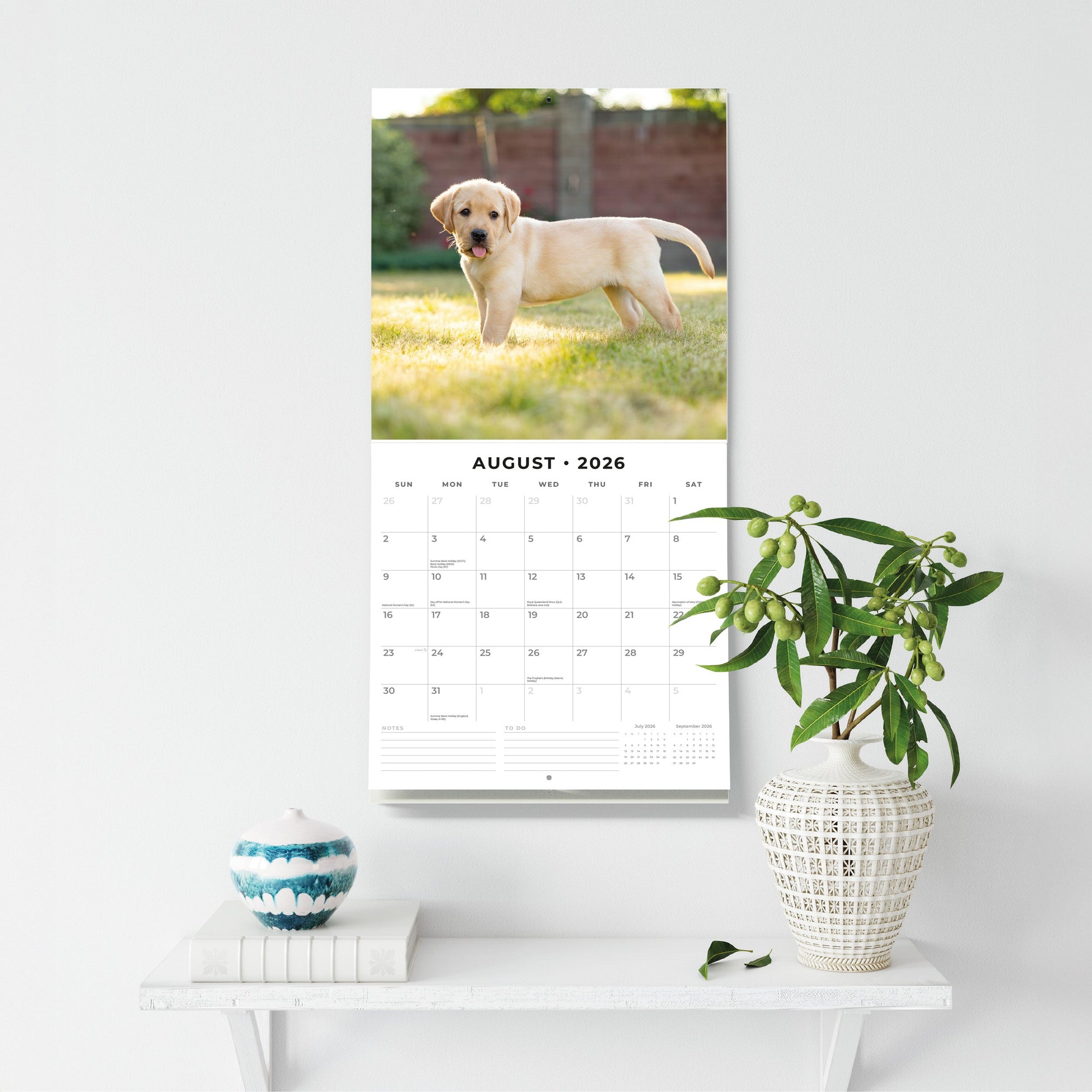 Brighten every day with this Yellow Labradors calendar, opening to 12" × 24" printed on premium thick & sturdy paper. The hangable 12-month format is 100% plastic free and includes a lined notes & to-do area on each page—perfect for picnic planning, swim sessions, or daily gratitudes—while vivid spreads highlight their buttery coats and friendly smiles.